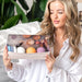 Inside our Anxious AF Box: 1 Yennifer bomb, 1 Tahitian Vanilla bomb, 1 Sunrise bomb, And three of our new Shower steamers: Rage diffuser, Twilight, and Breath.